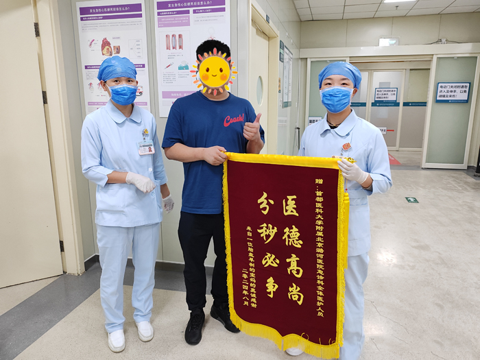 妥当处置后,产妇恢复良好。出院后在家人的陪伴下再次来到附属北京潞河医院,为医护人员送上锦旗,向他们表达了真挚的谢意!这面锦旗既是对潞河医院危重孕产妇救治工作的赞赏和肯定,更是对所有参与救治工作的医护人员的鼓舞和鞭策,激励着大家继续以饱满的工作热情为区域百姓的生命健康保驾护航!