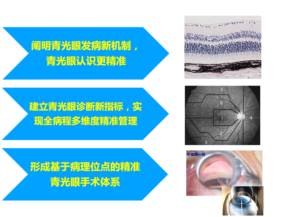 在基础科学研究和临床医疗技术的支持下,重点着力于对青光眼的病理机制研究、青光眼诊疗技术与设备的研发,青光眼微创手术的技术改良与创新、开发眼科前段微创手术器械和设备、开拓新型设备在眼前段疾病诊疗中的应用等。