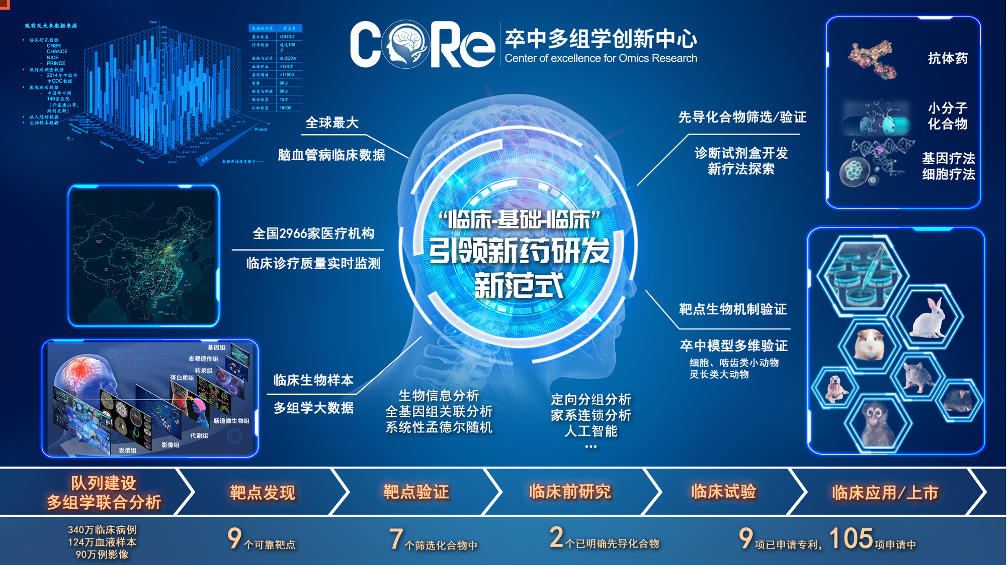 中心开展中国国家卒中登记研究Ⅲ(CNSR-3)等多项研究项目,已完成近10万人次卒中患者的临床数据及生物样本的采集,在库生物样本包括血清、血浆、白细胞、尿液等多种类型。在CNSR-3研究基础上,中心对所采集的万余人血样进行全基因组学、表观遗传学、蛋白质组学、肠道微生物代谢组学等多组学检测,建立卒中研究多组学大数据并成立卒中多组学创新中心(Center of excellence for Omics Research, CORe)。CORe利用先进的高通量测序和质谱技术整合卒中多组学大数据,建立了卒中多组学数据库STROMICS(http://stromics.org.cn/index.html),分析多组学信息、临床信息与卒中的关系,挖掘与卒中相关的潜在标记物和干预靶点,建立基于多组学的药物靶标研究新范式,实现临床医学与生物信息学的跨学科交叉融合,精准定位与卒中结局具有因果关系的基因和生物标志物,提升药物靶标研发效率,降低研发投入、缩短研发周期。CORe汇聚不同领域专家人才,形成跨学科优势,为中国医药产业升级注入新动能,助力中心实现卒中的精准诊断和个性化治疗,降低医疗支出,提升国民健康水平;助力中心明确不同病因卒中的相关危险因素及临床预后差异,揭示不良预后的病理生理学机制;助力中心建立卒中复发的预警模型,实现在精准预测风险分层的同时在临床中转化应用,建立基于标准诊断流程进行精准病因分型的中国卒中研究队列。